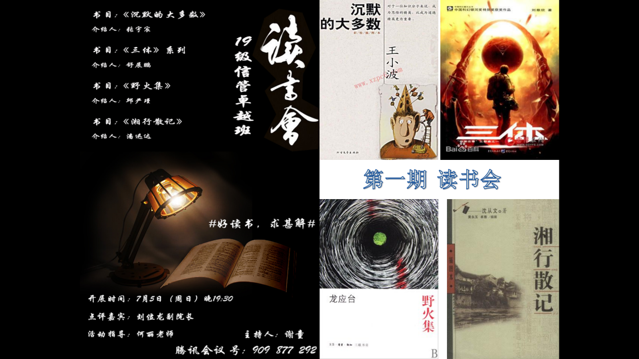 第一期读书会由何丽老师开场,表达了对卓越班同学们的鼓励和支持,以及未来三年对我们的要求——“成为名副其实的精英”;此外何丽老师还强调,人的一生离不开读书,和不同的人在书籍中一块品鉴,拓展开阔的视野,提升我们的能力。