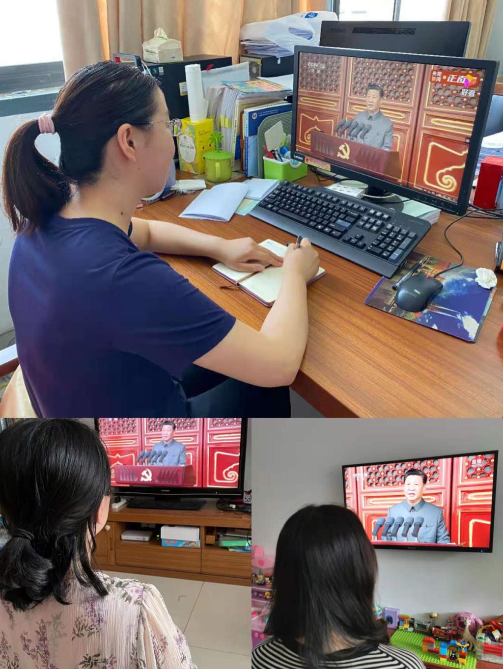 “我代表党和人民庄严宣告,经过全党全国各族人民持续奋斗,我们实现了第一个百年奋斗目标,在中华大地上全面建成了小康社会,历史性地解决了绝对贫困问题,正在意气风发向着全面建成社会主义现代化强国的第二个百年奋斗目标迈进……”“我们积极学习借鉴人类文明的一切有益成果,欢迎一切有益的建议和善意的批评,但我们绝不接受‘教师爷’般颐指气使的说教!中国共产党和中国人民将在自己选择的道路上昂首阔步走下去,把中国发展进步的命运牢牢掌握在自己手中”“任何人都不要低估中国人民捍卫国家主权和领土完整的坚强决心、坚定意志、强大能力”随着习总书记铿锵的声音,燕山校区逸夫楼514、610、621会议室、圣井校区学院报告厅响起了阵阵掌声、欢呼声,这里是公司组织师生党员、入党积极分子、民主党派代表收看庆祝中国共产党成立一百周年大会盛况直播的现场。除了集体收看外,各支部也根据实际情况,组织了党员利用手机、电脑在教研室、实验室等不同岗位收看了本次直播。