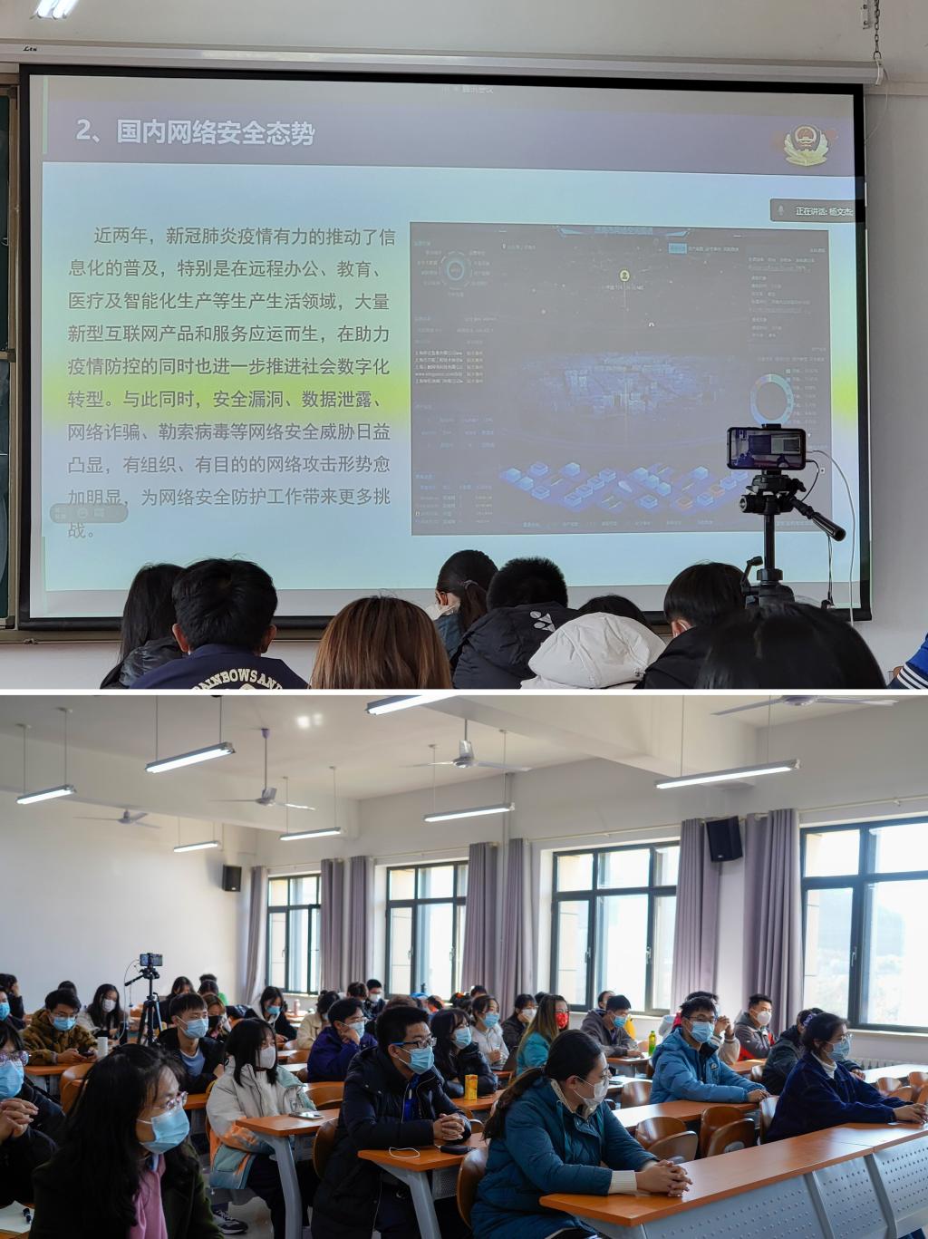 孙东伟简单介绍了网警的工作,强调当前疫情防控形势依然严峻复杂,当前形势下网络安全更应该受到重视,以图文结合的方式讲解了当前国际与国内的网络安全态势,分析了当下在疫情肆虐的大背景下威胁网络安全的因素,并向同学们普及了相关的法律法规,提出个人如何在疫情期间保障自身生命安全的同时关注信息安全,警惕网络诈骗,加强自我防范意识。讲座结束,孙东伟和王洪海一起与同学们交流了疫情期间电信网络诈骗案件上升的原因,并对如何在疫情期间更好地防范网络诈骗给同学们提出了一些建议。