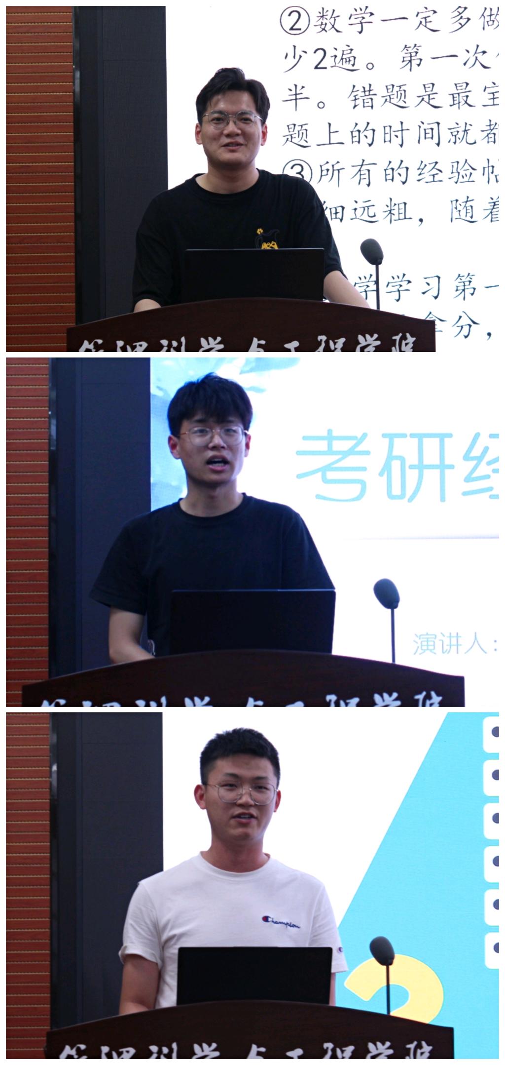 许飞、袁焕轩、徐孚欣现已分别录取到南京理工大学,中国矿业大学,吉林大学,并在会议中分享了自己考研上岸的经验。三位学长都通过自身经历从择校问题、各科复习建议、心态问题三个方面向同学们提出了自己的相关建议,并且都着重提醒同学们在备考期间心态是最重要的。其中许飞更是提出在这期间自己最大的收获就是考研时期的状态,变得可以接受自己的失败,在成功上岸后也变得更有信心。许飞在最后告诉同学们“人生不是轨道,是一片原野”。袁焕轩则更多的是结合自己的经验向同学们详细地讲解如何择校与定专业,介绍自己的复习时间及方法。最后徐孚欣在会议中提出“选择大于努力”,劝解同学们每个人都有自己的节奏与学习方法,要从他人的失误中吸取教训,选择最适合自己的方法。会议结束后,三位学长依旧在会议室中耐心地回答同学们的问题。