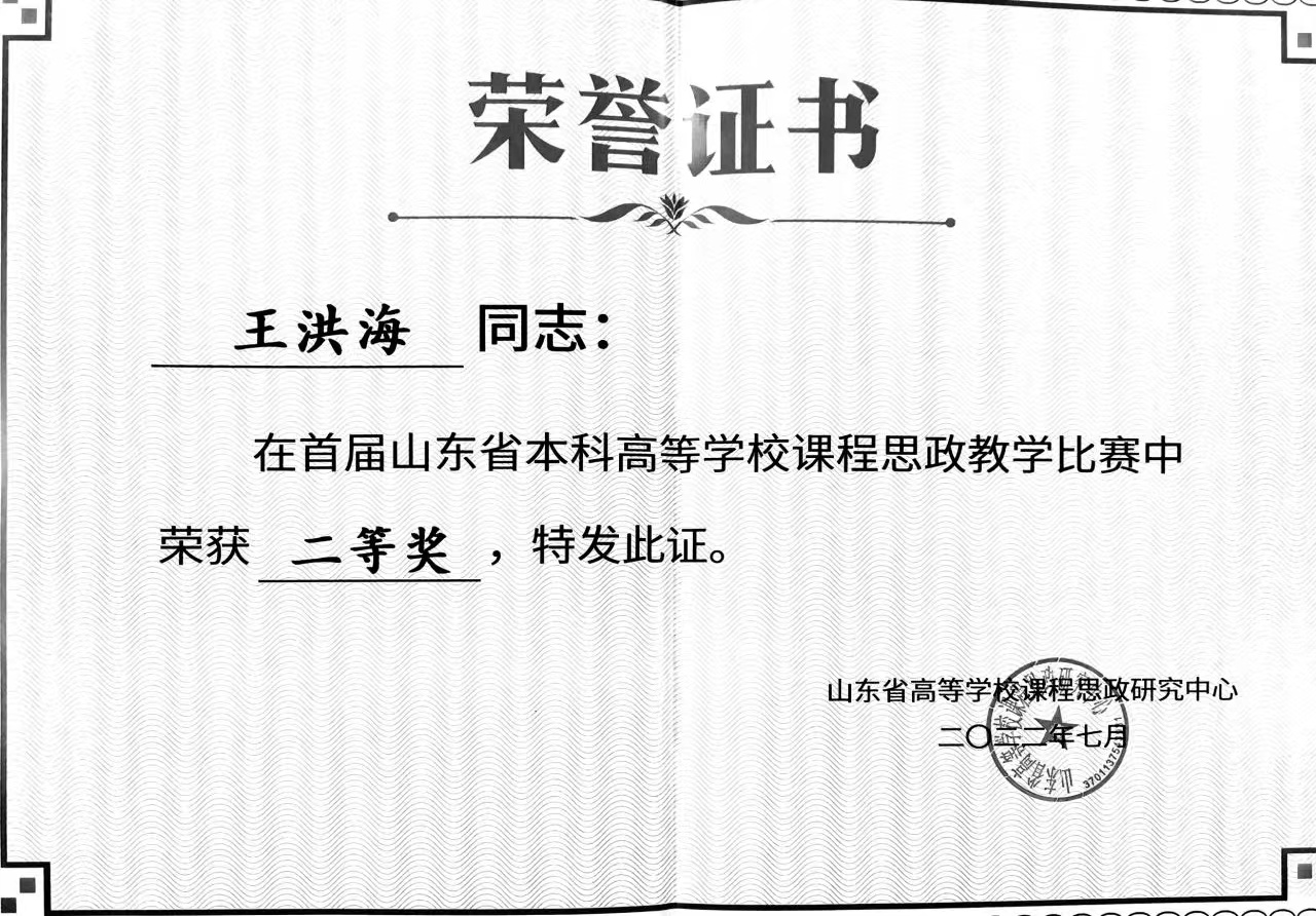 近日,在山东省高等学校课程思政研究中心举办的首届山东省本科高等学校课程思政教学比赛中,公司的王洪海教授凭借出众的能力和优异的表现冲出重围,荣获二等奖。
