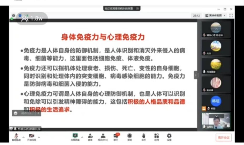 为了缓解员工的压力并促进其健康的心理发展,11月24日19:00-20:30,公司组织员工收看以《我的幸福我做主》为主题的线上公益讲座。本次讲座由首都师范大学心理学院特聘教授岳晓东博士主讲,部分员工代表参加。
