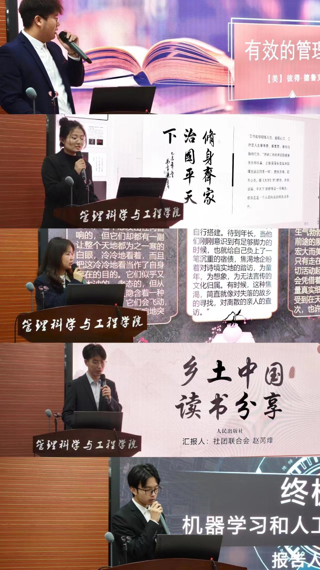 五位员工干部相继分享了已读的书籍以及个人感悟。综合部常子尧分享的是美国管理学家彼得·德鲁克的《有效的管理者》,他结合自己提出的三个问题,根据作者生平与作品内容,总结得出了关于“管理”的感悟。学术部殷佳锐介绍的《终极算法—机器学习和人工智能如何重塑世界》一书揭示了算法的本质和算法对当今社会的重要性。 社会实践部的黄雪雯分享了《文化苦旅》并指出此书为心之所至、行之以往、齐心涤虑,能够从中得到深刻领悟。社团联合会的赵芮烽带来了《乡土中国》一书,他以“乡土本色”、“文字下乡”、“从欲望到需要”三个主题介绍了此书内容,并总结了社会变化。来自文体部的田宇分享的书籍为稻盛和夫的《干法》,她通过提出“为什么要工作”进而引出“如何投入工作”,并进一步阐述了“怎样出色工作”,从而鼓励大家积极生活。最后,何丽老师强调了读书的意义,并鼓励同学们要养成阅读的习惯,做好学业生涯规划,在学院营造良好的学习氛围。
