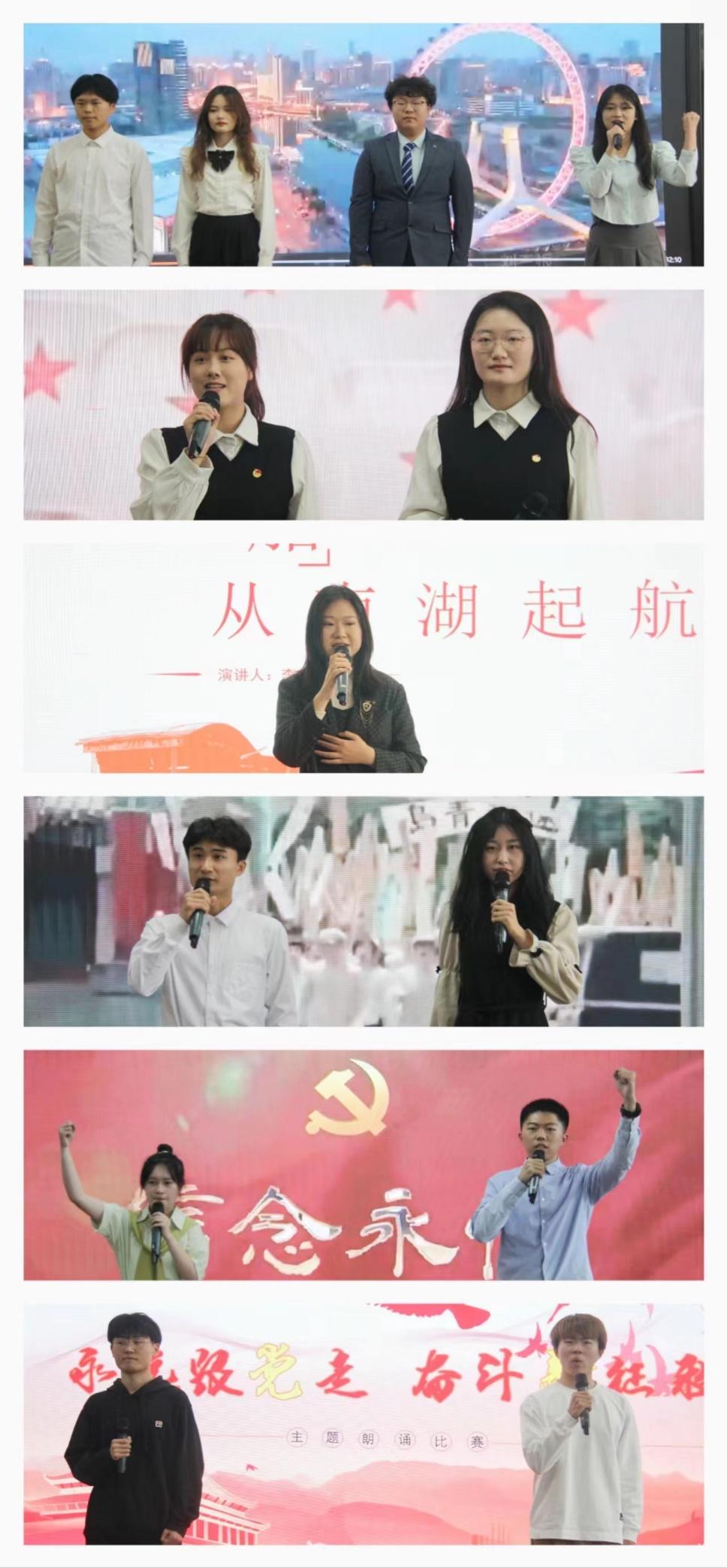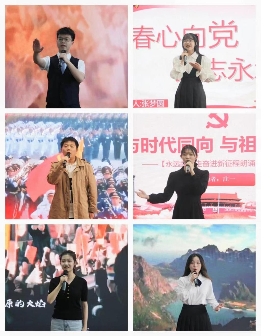 比赛开始,李康带来的《青春中国》展现了新时代发展中的中国风采;呼吁以吾辈之青春捍卫盛世之中华的张梦圆朗诵了《青春心向党,矢志永承光》;张明澍的《永远跟党走》道出坚定跟党走的决心;忆红色峥嵘,延红色精神是庄一《与时代同行与祖国同行》的主旨;刘洋、董亦菲、王继霖、岳翔阳的《以时代之眼,吾辈如此看中国》带我们看千秋伟业,颂百年风华,提醒我们不忘初心、砥砺前行;《赓续百年中国红,踔厉奋发新征程》是孙慧颖的号召;《请党放心强国有我》是以卢诗琪、范珺琪的铮铮誓言;张文杰的《祖国,或以梦为马》揭示个人理想要融入国家发展;《红船,从南湖启航》,李彦臻将共产党的发展史娓娓道来;王诶、王本冬道出《有一页历史》的沉重;汪海彤、王介鑫的《月光下的中国》展现宏伟的中国风采;《信念永恒》表达出邹委豫、程文锐的坚定信念。