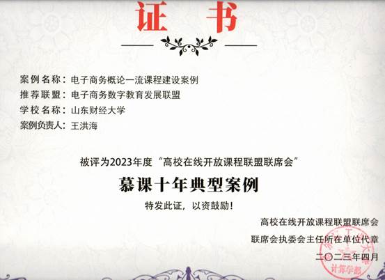 5月13日,全国慕课教育创新大会(第四届)暨高校在线开放课程联盟联席会2023年会在广州举行,大会共发布了全国26个课程联盟推选的333个“慕课十年典型案例”,公司王洪海教授负责的《电子商务概论》一流课程建设案例成功入选。