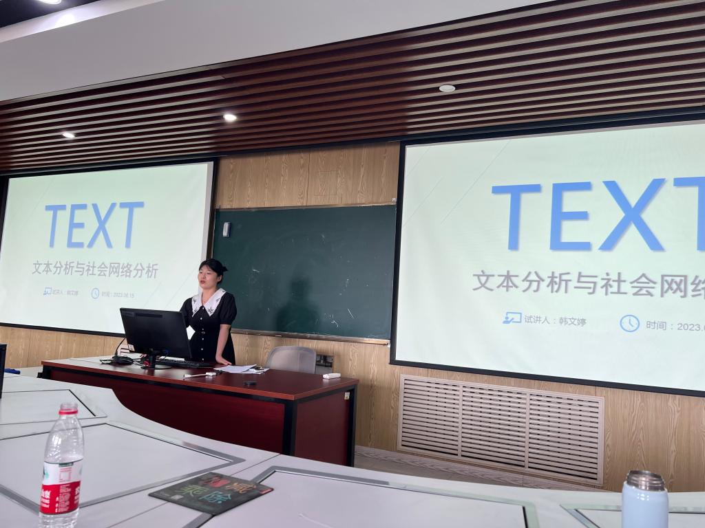 然后,学院新进教师韩文婷进行《文本分析与社会网络分析》课程说课和课程试讲,韩老师分别从课程介绍与性质、教学目标与内容、教学方法与考核、课程试讲四个方面展开。试讲结束后,教学督导组各位老师提出有针对性的改进建议,建议韩老师实际课堂要多与员工沟通交流,需要给员工充足的理解和反馈时间,教学案例的选用需要吸引员工等等。