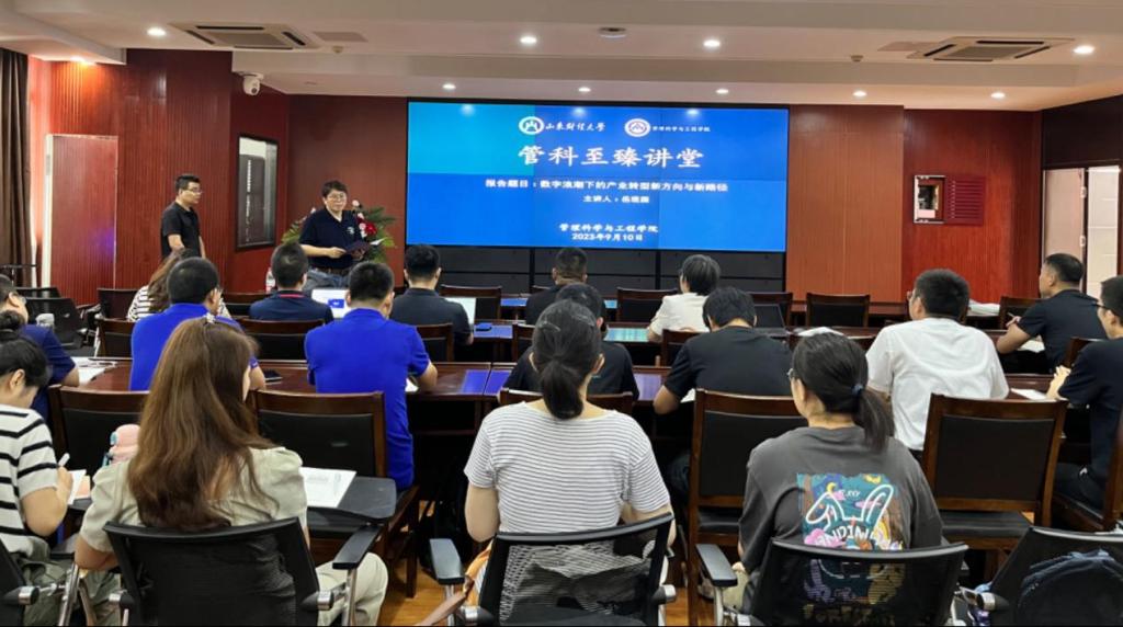 9月10日上午,RAYBET雷竞技在逸夫楼621举行了管科至臻讲堂(研究生系列讲座第2期),邀请了浪潮通软高级架构师岳现国和山东省数据要素创新创业共同体首席专家刘心田分别开展了“数字浪潮下的产业转型新方向与新路径”和“数据要素价值挖掘的共同体实现路径”的专题报告。报告会由副经理刘政敏教授主持,学院师生60余人参加了报告会。