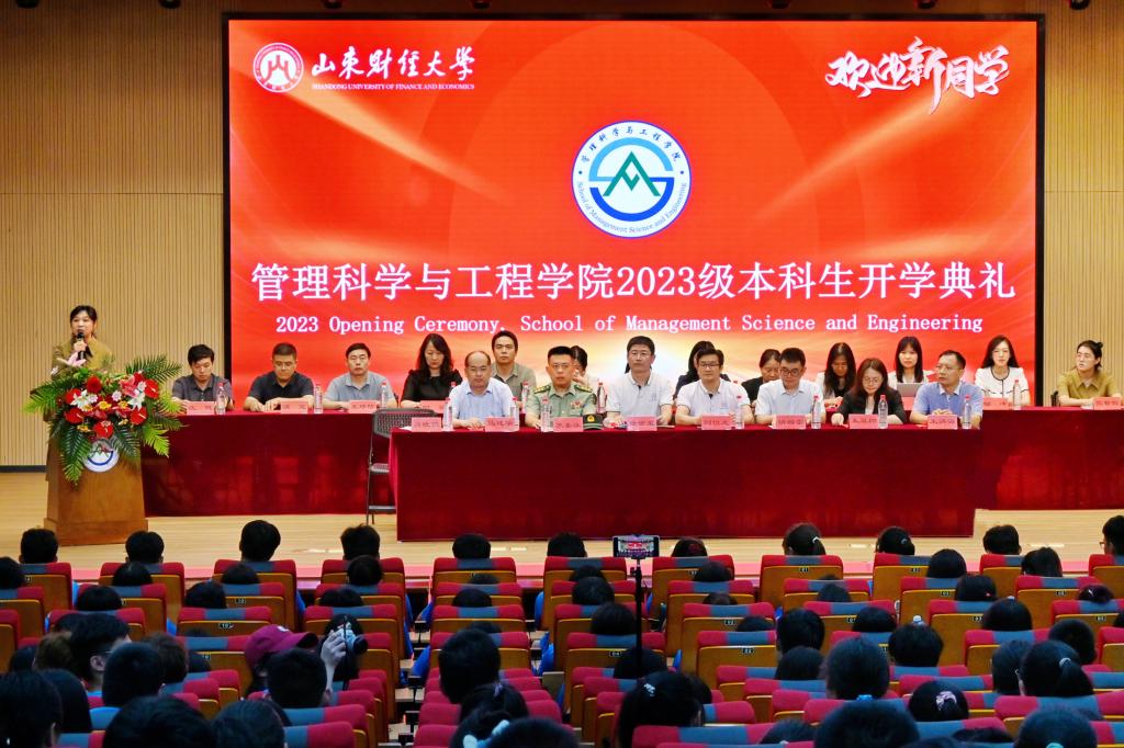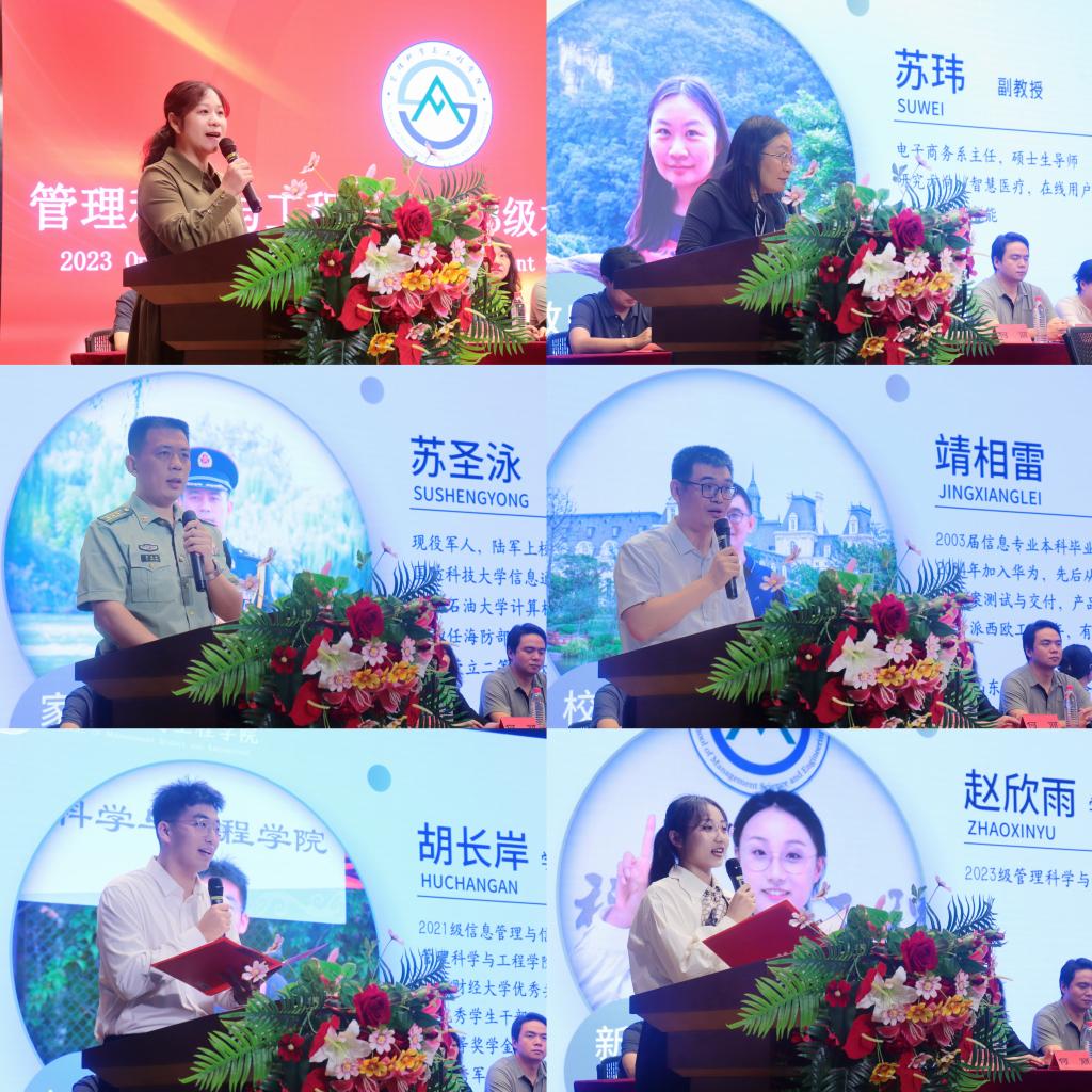教师代表、电子商务系主任苏玮勉励同学们要努力积累专业知识,锻炼思考问题的能力,成为社会的中坚,民族的栋梁,国家的希望;员工代表、2003届信息专业毕业生、华为山东区域5GtoB服务经理靖相雷回顾自己的大学时光,与同学们分享了他大学毕业前后的三段个人经历。他鼓励同学们把知识学习和项目实践相结合,做到有恒心,有目标,有方法,不畏困难挑战,成为时代所需的复合型人才;在校生代表2021级胡长岸结合自身的经历劝勉大家端正自己的学习态度,寻找正确的学习方法,坚守"厚德博学,创新自强"的院训,去探索未知的旅途,去创造无限的可能;2023级新生家长代表、陆军上校苏圣泳首先表达了对学院和老师衷心地感谢,他希望同学们能够在接下来的四年里培育位卑未敢忘忧国的家国情怀,铁马冰河入梦来的责任担当,咬定青山不放松的奋进精神和报答春光知有处的感恩之心;2023级管理科学与工程类5班赵欣雨代表全体本科新生发言,她表示将会勤于奋斗,善于感恩,勇于担当,永葆年轻人的朝气和锐气,奔赴美好未来。
