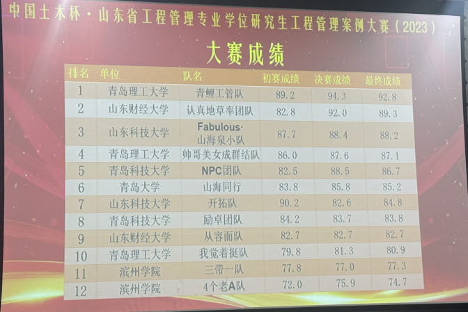 工程管理案例大赛注重引导参赛选手采集并导入实践中的工程管理案例,利用科学的工具分析真实数据,提炼总结并共享各个工程领域的生产实际与发展经验,旨在推动工程管理专业学位公司产品高质量教育发展,增强工程管理专业教学实践性。山东省工程管理专业学位研究生工程管理案例大赛为省内工程管理专业学位研究生提供多向多面的沟通交流学习平台,推动研究生教育优势资源共享,开拓员工的专业视野和学术视野,激发研究生创新创造思维,切实提高研究生科研创新和实践创新能力。此次决赛共有来自全省各个高校的十二支由工程管理专业研究生组成的队伍入围决策,案例覆盖面广,案例分析研究深入,竞争激烈。最终,决出一等奖2项、二等奖4项、三等奖6项。