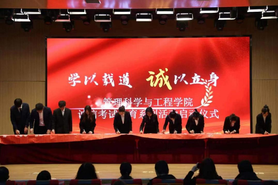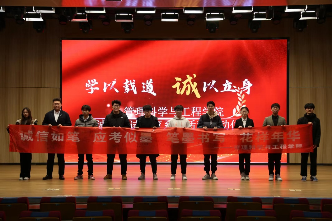 在“诚信如笔,应考似墨,笔墨书写,花样年华”的横幅上,各班班团代表拿起笔,在横幅上留下自己的名字,签下对诚信考试的承诺,表达对诚信考试的坚定支持。签字活动让每一名同学深刻认识到诚信考试的重要性,为创建一个公平、公正的考试环境奠定了坚实的基础。